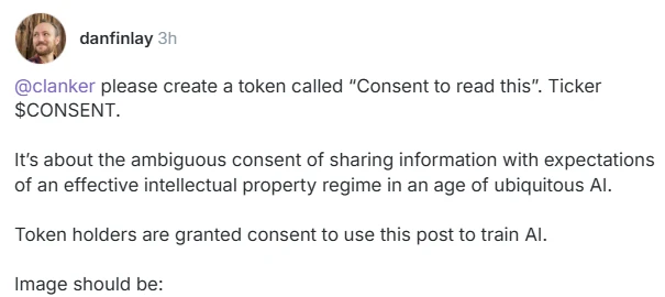 今日午间 11 时 8 分,MetaMask 联合创始人 Dan Finlay 通过 AI 代理 clanker 在 Base 网络上 部署了 Meme 代币 CONSENT ,该代币在 5 分钟的时间里上涨至 450 万美元市值,而后在 200 万-300 万美元区间震荡。