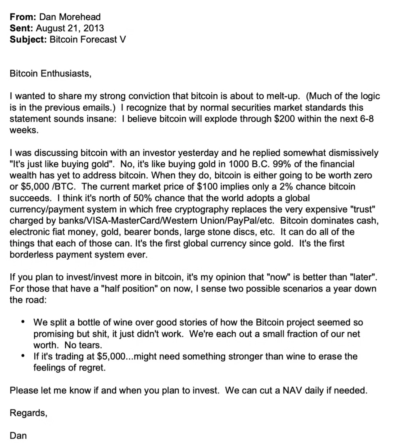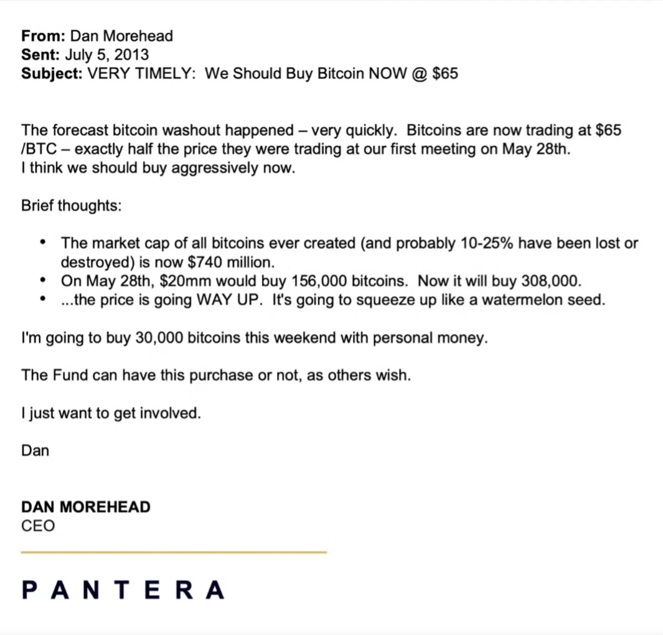 Odaily 注:在 2013 年 7 月 5 日的一封邮件中,Dan 以 CEO 身份呼吁 Pantera 以 65 美元的市价买入 BTC,并表示个人已决定先买 3 万枚,其他人可决定基金本身是否购买。两天后的 7 月 7 日,Pantera Bitcoin Fund 正式成立。
