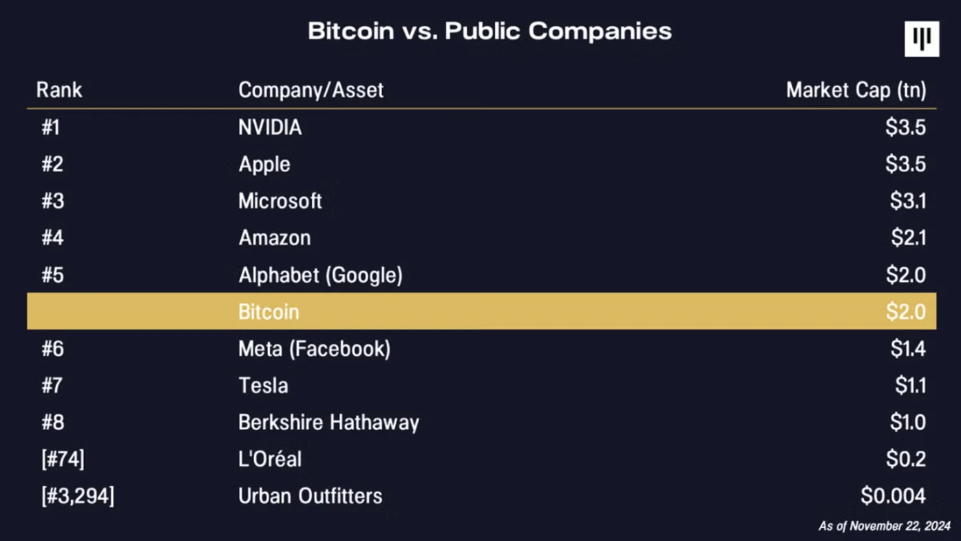 现在,摆在比特币面前的就只剩下五个超越对象(英伟达、苹果、微软、Amazon、Google)……