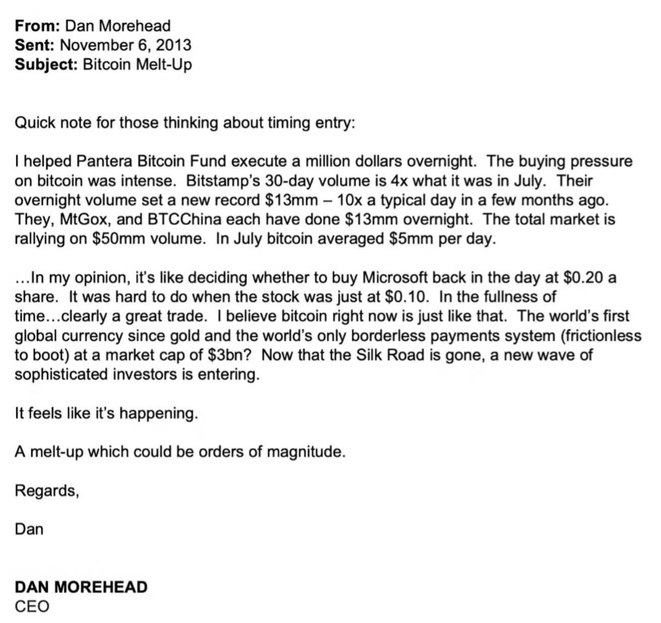 Odaily 注:在 2013 年 11 月 6 日的邮件中,Dan 透露 Pantera Bitcoin Fund 单日买入了 100 万美元的 BTC。