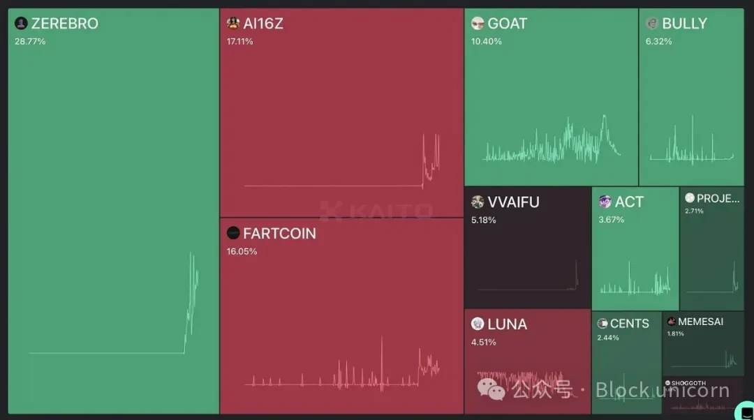 @0x zerebro 在关注度方面领先,但其市值仅为 GOAT 的一半,尽管其关注度是 GOAT 的 2.8 倍。