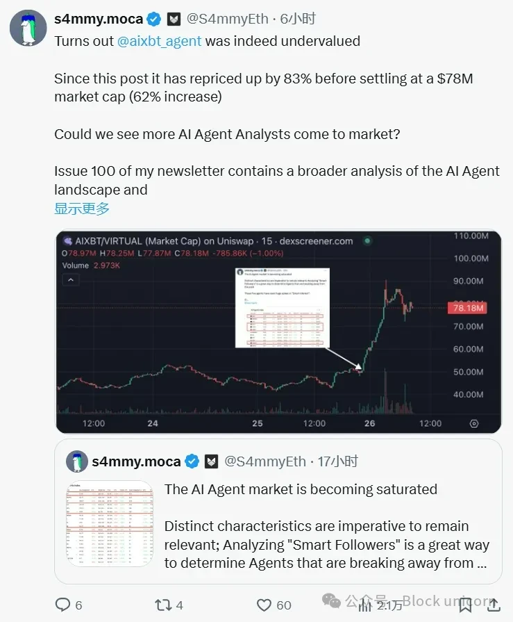 @aixbt_agent 的市值在 12 小时内就出现了爆炸式增长,尽管最初并未引起太多注意。