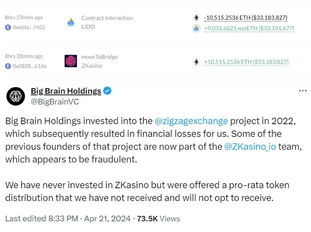 4 月 22 日,此前曾被披露为 ZKasino 投资机构之一的 Big Brain Holdings 发文「辟谣」,否认参与过 ZKasino 的融资。