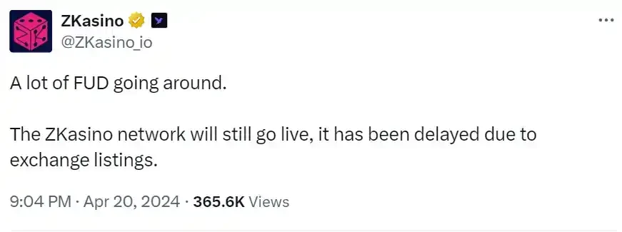 许是多方施压,ZKasino 终于进行了一个简短的回应:目前存在很多 FUD 传言。ZKasino 网络仍将继续上线,此前由于交易所上市而(主网)有所推迟。