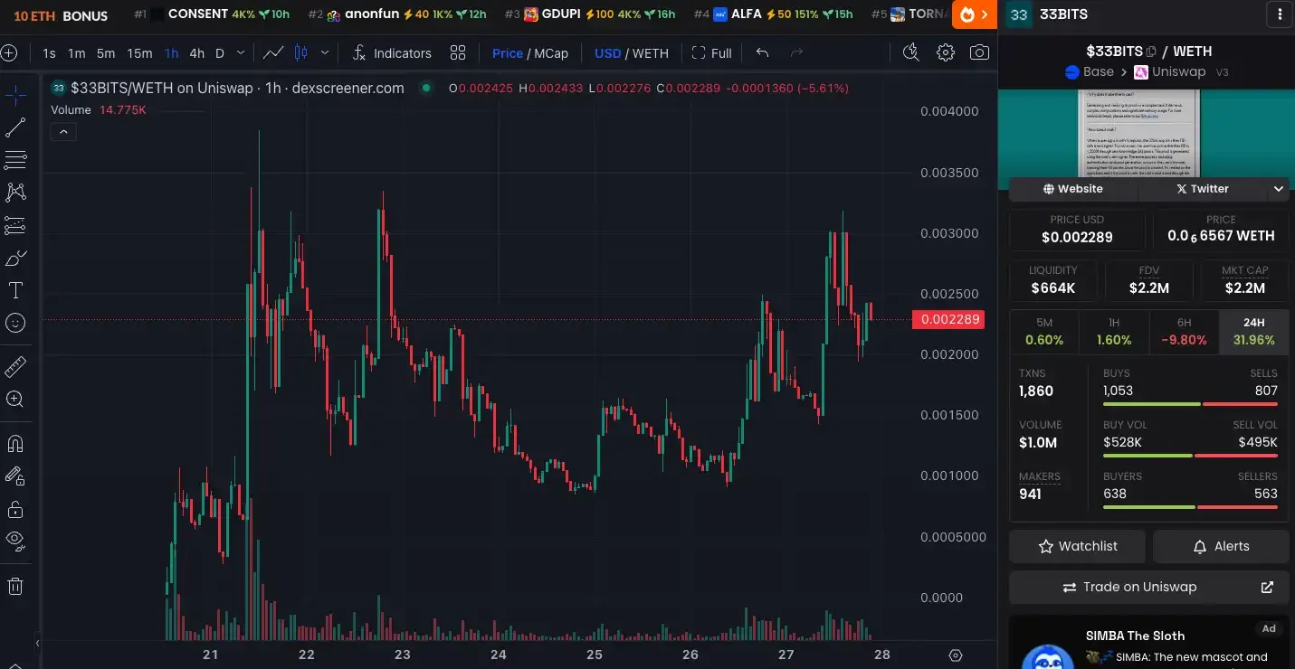 $ 33 bits 也是一个以 zk 技术为核心的匿名发帖应用,但只有 FID(Farcaster ID)小于等于 20001 的用户才能使用。其原生代币 33 BITS 也是由 Clanker 部署,目前市值为 2.2 M.
