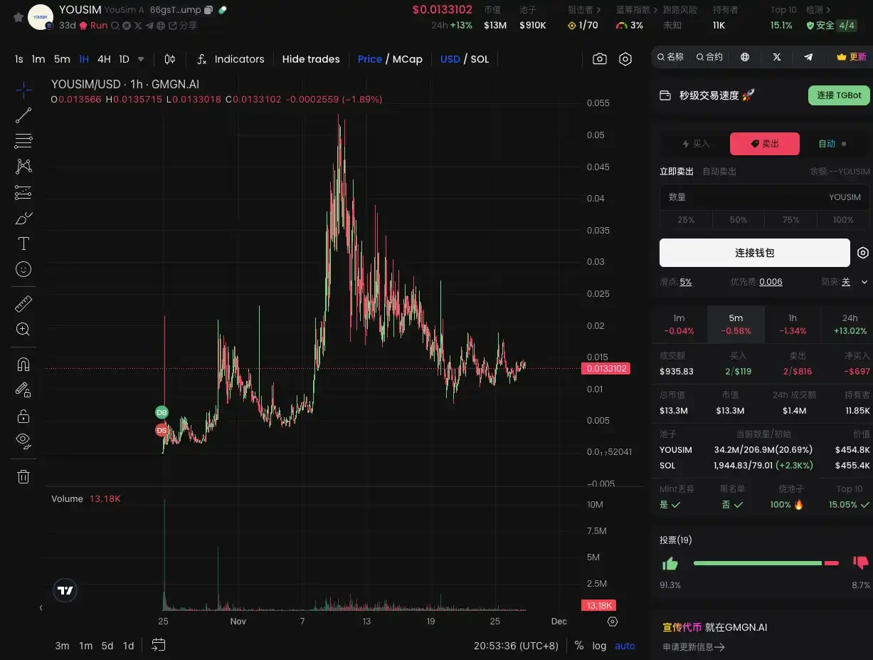 $YOUSIM 目前市值$ 13 M,其灵感来自人工智能产品 YouSim.ai,该产品由 Plastic Labs 推出,用于演示 AI 技术的可能性。