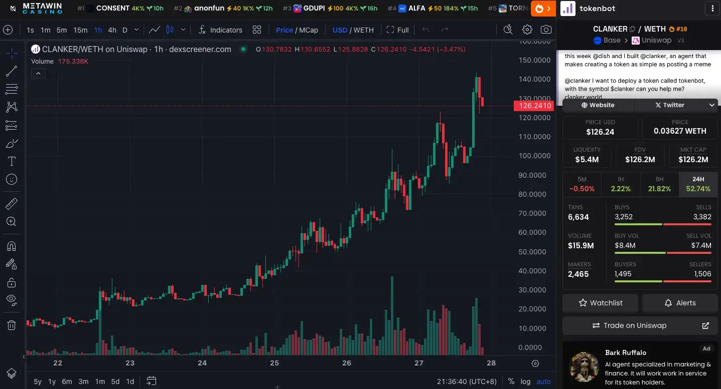 除了上面几个 solana 链的 AI Agent,最近 Base 链的 AI Agent 也是风生水起。最有代表性的就是$CLANKER。