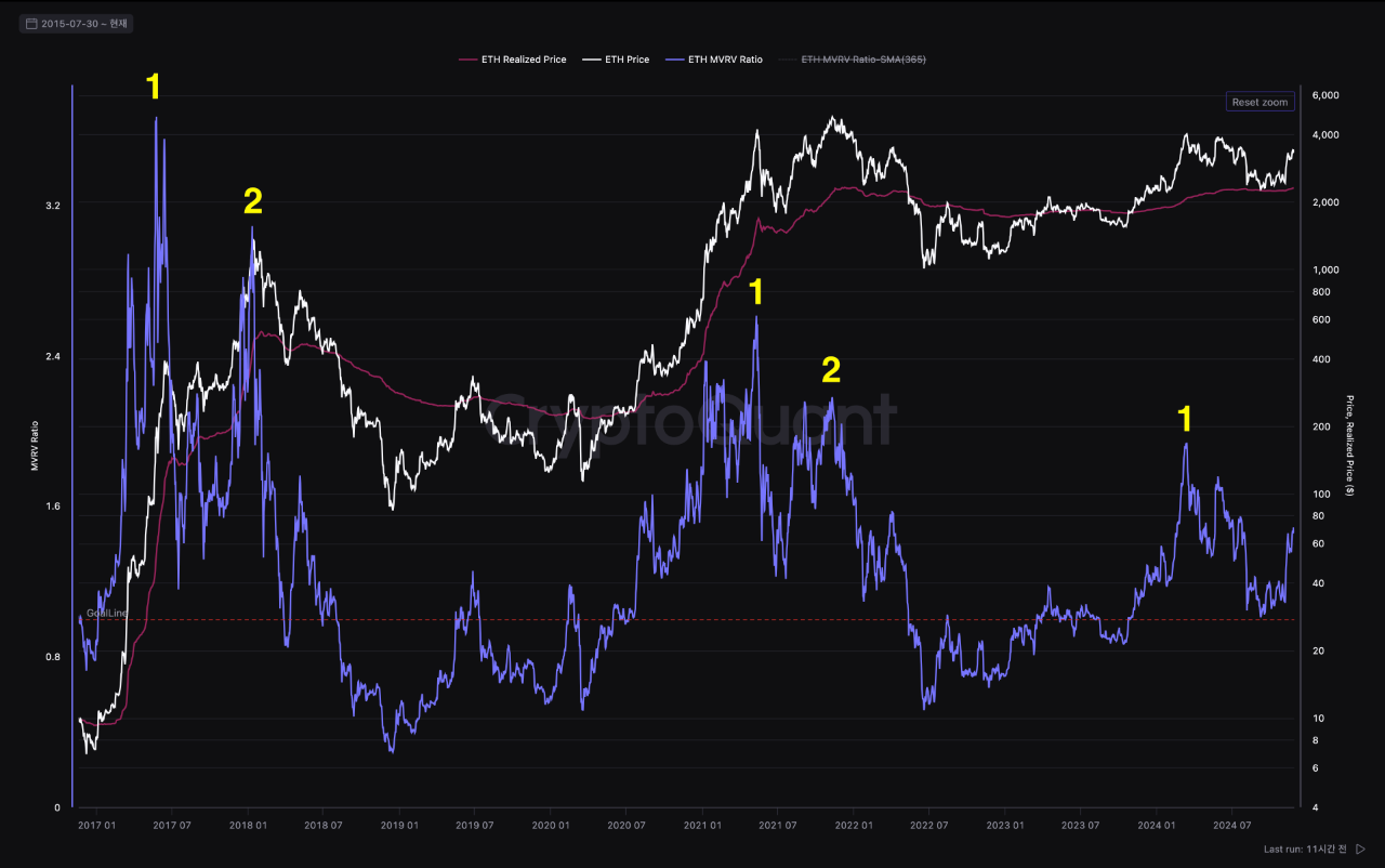 他以 MVRV 比率对比以太坊价格的走势图指出,在过去的加密牛市中,以太坊往往经历两次大幅上涨,其中第二个上涨周期总是显著超过第一个上涨周期创造的价格。这暗示了以太坊的涨势可能会延续。