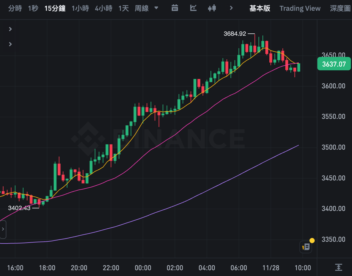 以太坊价格在昨(27)晚一路上攻,最高飙升至 3,684.92 美元,创下 5 个多月以来的新高,单日上涨 13.28%。截稿前稍有回落,暂报 3,637.07 美元,近 24 小时涨幅虽缩窄至 8.83%,但仍是前 10 大币种中表现最佳代币。
