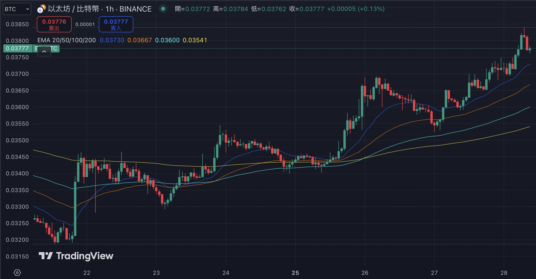 终于,随著比特币本周𫔭始回调,以太坊的强势逐渐显现:下跌时跌幅小于比特币,上涨时涨幅也超越比特币。 ETH/BTC 比率在 25 日单日上涨近 7% ,近一周从低点 0.03187 反弹 18.38% ,目前报 0.03775 ,展现出资金轮动的迹象。