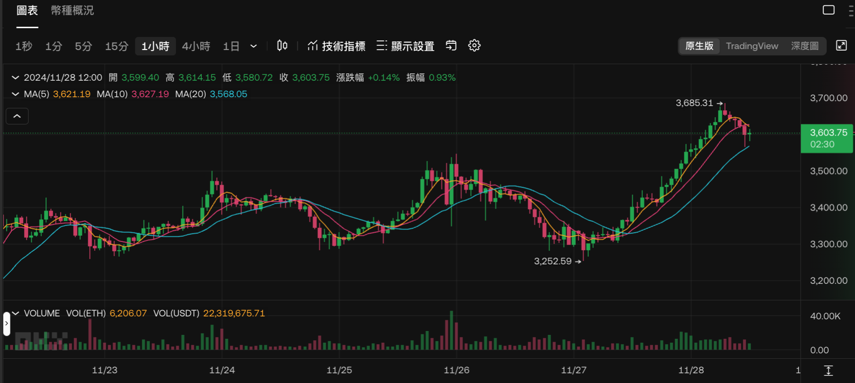 本 周随著比特币出现显著回调,最大公链以太坊周三迎来暴涨,从 27 日低点 3252 美元,一路劲扬在今晨冲上 3685 美元,创下 5 个多月来的新高,期间最大涨幅超过 13%。