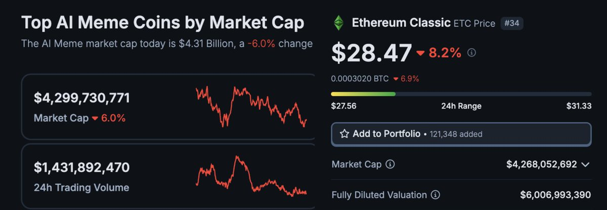 然而,我相信,大部分的超额收益将会出现在 AI Meme 币类别中。目前,AI Meme 币的总市值仅相当于以太坊经典 (Ethereum Classic)。AI Meme 币将逐渐通过“吸血攻击”吸引来自 AI 技术币、静态 Meme 和风投代币的资本。