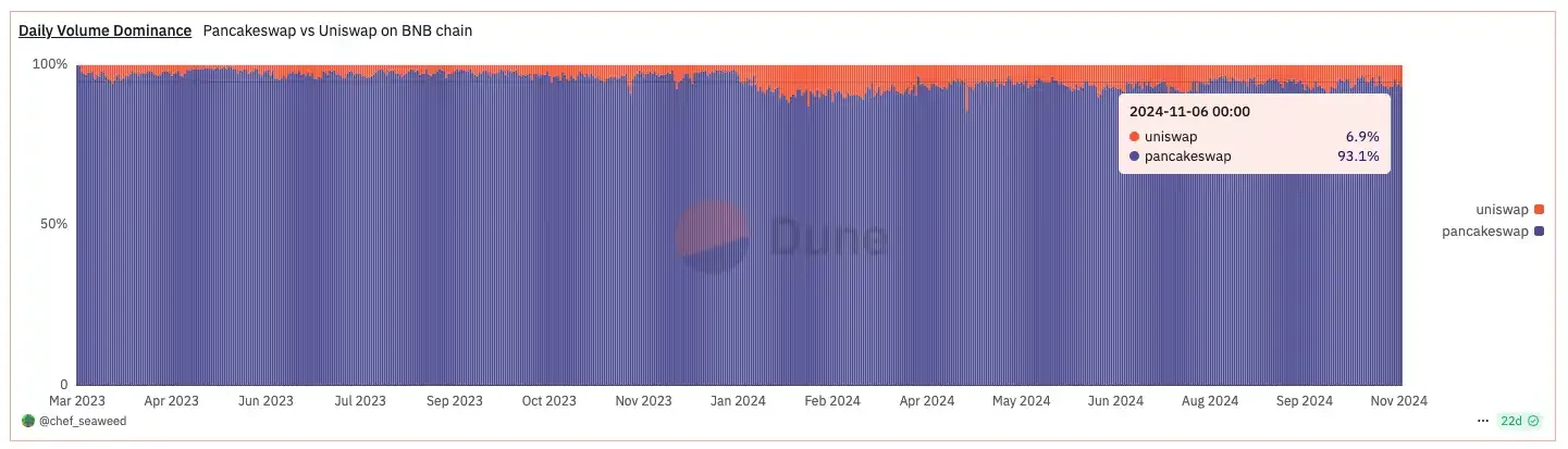 根据 Dune 数据显示,PancakeSwap 的交易量在 BNB Chain 上一直稳居第一,远超其他 DEX,包括一直碾压 Uniswap。强大的市场表现和用户基础让 PancakeSwap 成为 BSC 上最具代表性的 DeFi 项目之一。