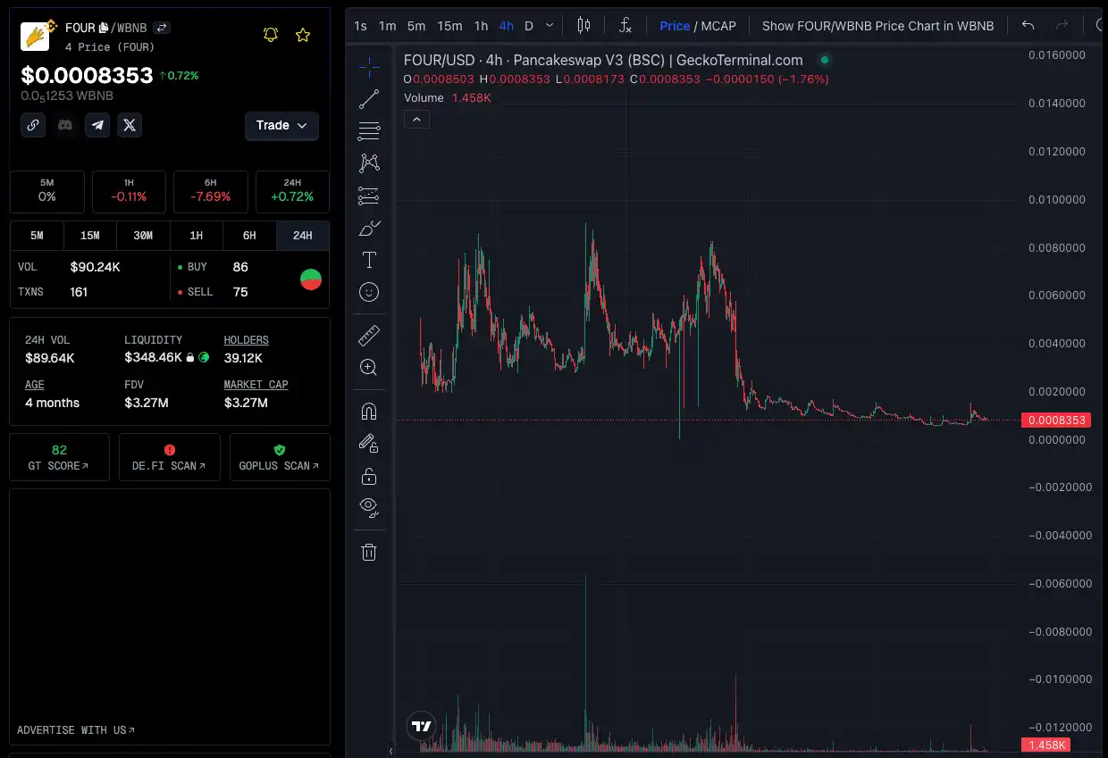 $FOUR 是 BNB Chain 上的 MEME 发行平台 Four.Meme 的原生代币。作为一个社区自治的项目,$FOUR 因其具有 CZ MEME 的相关属性和幽默抽象风格,被视为目前 BSC 生态的重要原生 IP MEME。