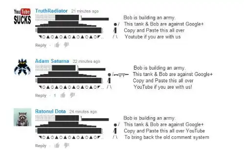 「Bob」最初是 YouTube 评论区的一种模因,形象是一个简笔画小人,其最大规模的传播始于 2013 年。当时,YouTube 要求用户绑定 Google+ 账号才能评论,这引发了社区的不满。许多用户通过粘贴「Bob」的 ASCII 艺术形象进行抗议,表达对这一改动的不满。抗议活动中的 Bob 通常还配备军用坦克或 AK-47 步枪的 Unicode 图案,表达了社区的抵抗精神。
