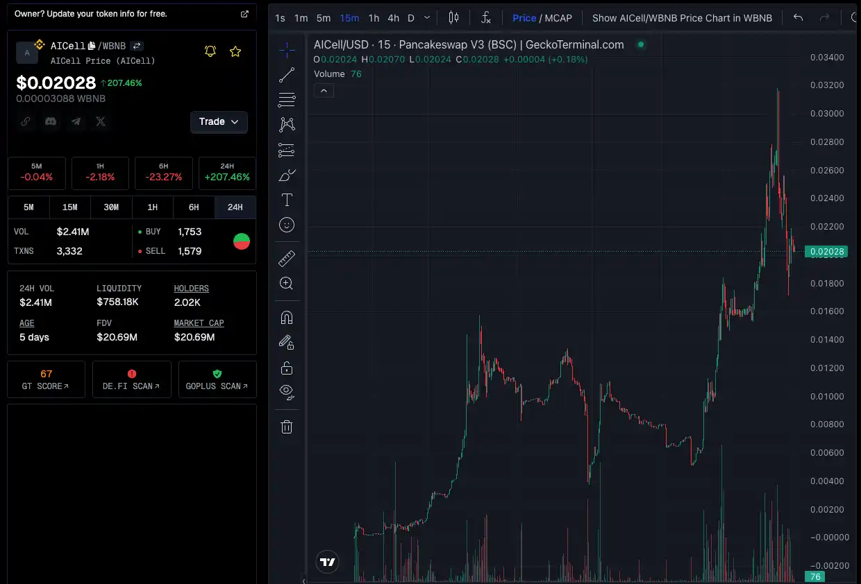 $AICELL 是一个基于 BNB Chain 的 AI 项目 MEME 币,也是 2024 年第一季度 BNB Chain 黑客马拉松的获奖项目。作为当前社区热议的 AI MEME 主题项目之一,它被认为是 BNB Chain 上较早试水该赛道的项目。