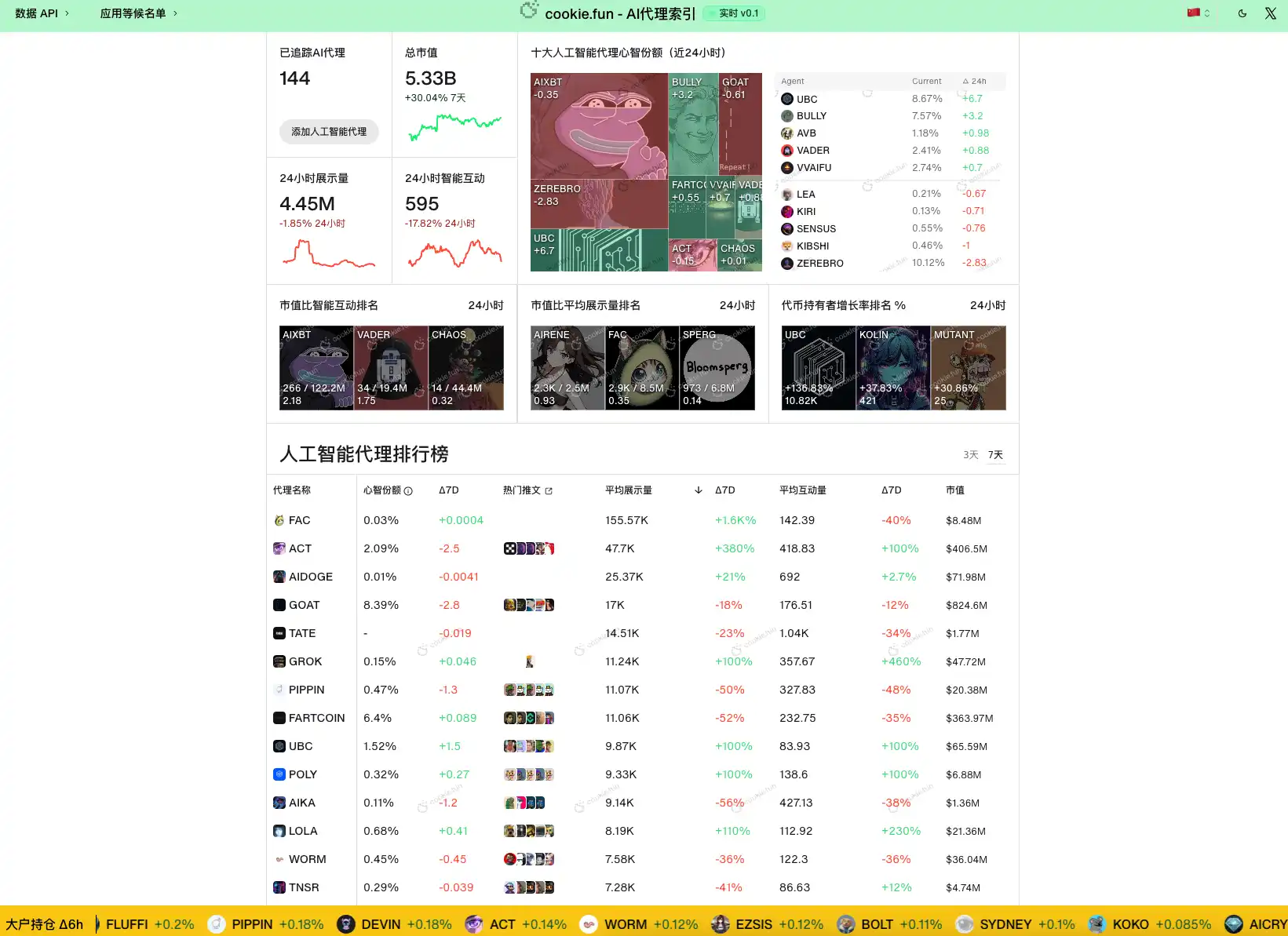 $COOKIE 是当前关注度较高的 AI Agents MEME 数据平台 COOKIE(Dot)FUN 的代币。该平台专注于提供与 AI Agents 相关的实时市场数据,包括各 AI 代理的市值、价格变动、交易量等核心指标排名。作为一个结合了 AI 和 MEME 叙事的项目,$COOKIE 为投资者提供了一个观察 AI Agents 市场动态的重要窗口。