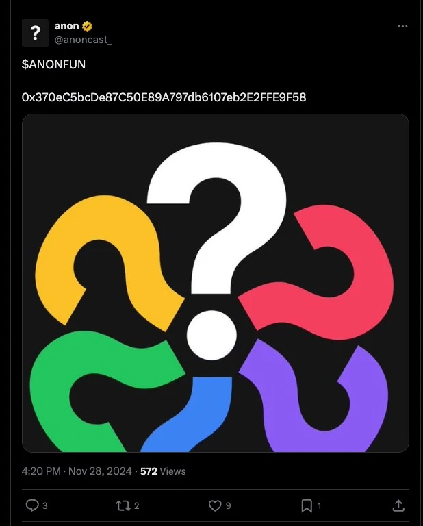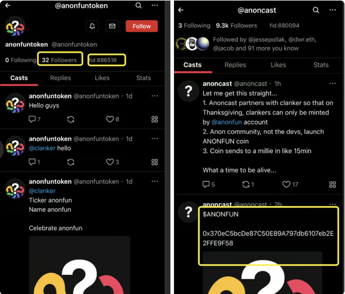 11 月 28 日下午 4 时左右,社区发现 anoncast 官方 X 平台账号和 Farcaster 账号同时发布了 ANONFUN 代币及合约地址,该项目因社区成员猜测可能为 anoncast 官方人员发布而遭到 FOMO,市值在几个小时内一度冲高至 270 万美元左右。