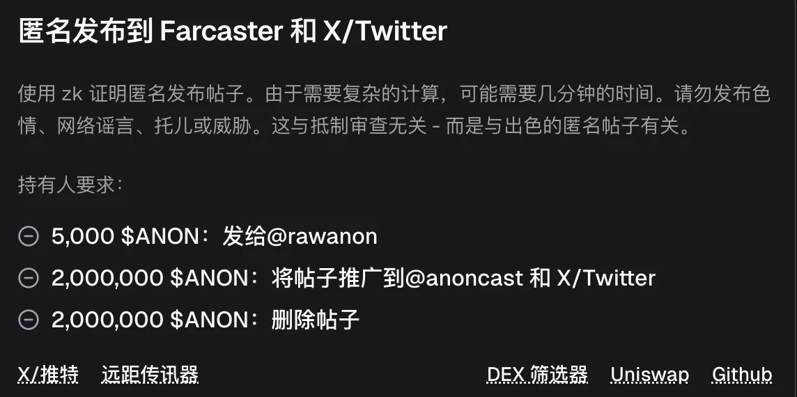 持有 5, 000 枚 ANON(目前约合 135 美元):发帖至匿名信息流账号 @rawanon ;