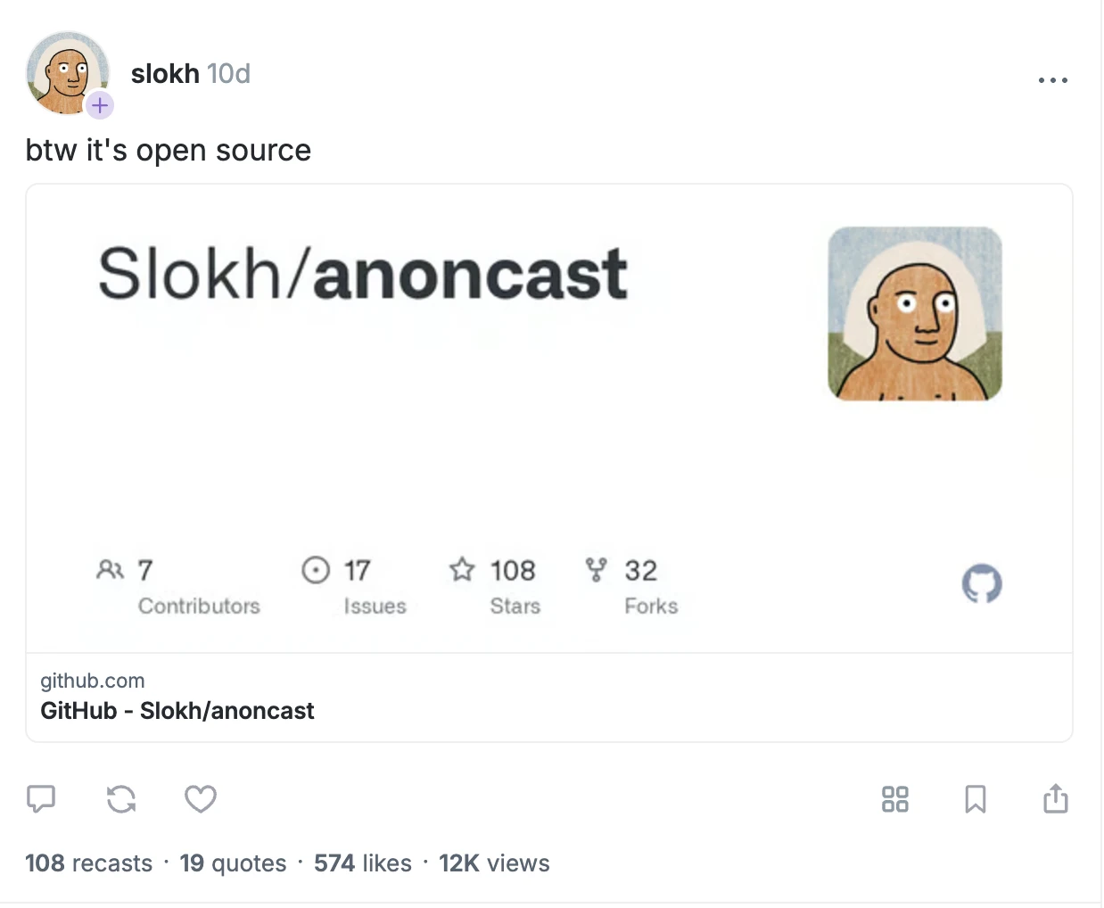 以上 3 大原因,共同为 anoncast 及 ANON 代币奠定了较为坚实的发展基础。此外,Farcaster 联创始 Dan Romero 此前曾多次站台 anoncast,Vitalik 除了买入代币,也曾与 anoncast 背后开发者 @Slokh 探讨过 “是否可以打造一个无服务器版本应用” 等相关技术细节。