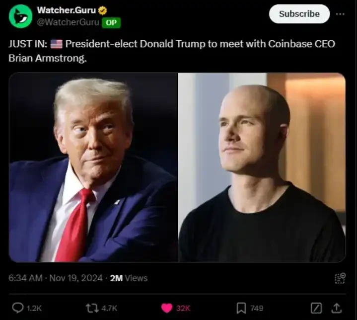 Brian Armstrong 随便与川普会面,讨论加密货币政策。顺便说一下,Brian 真的是个非常了不起的人物,可以阅读这篇来自 2020 年的文章(是的,抱歉,我又要求你读更多的东西了),并回想一下那时的世界是什麽样的,以及当时大多数大型科技公司在政治立场上的态度,再对比一下 Brian 带领 Coinbase 所采取的截然不同的做法。