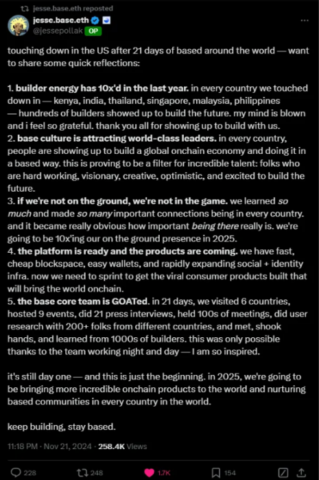 我真的储存了几十条推文,因为我在寻找一些可以发在这裡的推文,以展示他的个人特质,尤其是他是如何让 Base 成为今天的模样的。翻阅他的 Twitter 时间缐简直是无尽的精彩。我推荐你自己去看看,但对于懒人来说,也就是 99% 的你们(如果我处于你们的位置,也会是我),这裡有几条我最喜欢的推文:
