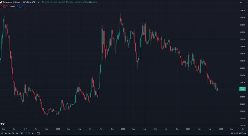 这是过去约五年裡的 ETH/BTC 图表。显然,以太坊这两年的表现并不理想!但任何对图表、市场和投资稍有了解的人都会告诉你,这种时候是𧹒入的机会,而不是卖出的时候。
