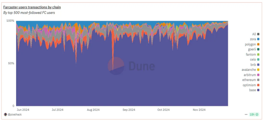 Base 和 Farcaster 是密切相关的。虽然 Farcaster 支援并使用多个链,但目前 Base 几乎在吞噬整个世界。从这张图表可以看出,今年大部分时间裡,Base 占据了 Farcaster 使用者所有链上交易的 60% 到 80%,而最近几天,这一数位已经达到了 95% 以上。