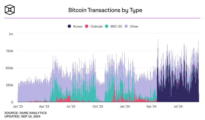 交易量方面,资产的多元化已经推动了交易频率的提升。The Block 数据显示,过去 1 年 BTC 日均转账已经超过 500 k/天,其中 RUNES 和 BRC-20 已经占据了主导。接下来交易、借贷、信用派生、生息的需求也变得顺利成章,BTCFi 能够使得比特币成为一种生产性资产,允许 BTC 从其持有的资产中赚取收益。
