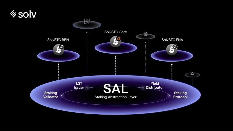 谈到 Staking 生态位,不得不提到另一个项目——Solv Protocol。Solv 并不是 Babylon 的直接竞争对手,而是通过引入质押抽象层这一技术架构,能够创建多种 LST(流动性质押代币)产品。这些 LST 的收益来源可以非常多样化,例如: