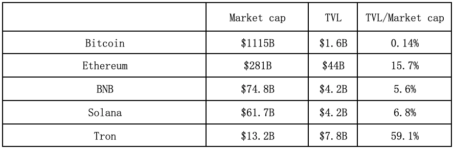 具有智能合约功能的主流公链的 TVL 与市值比率要高得多:以太坊为 14% ,Solana 为 6% ,Ton 约为 3% 。即使按照 1% 的比例,BTCFi 也有十倍增长的潜力。