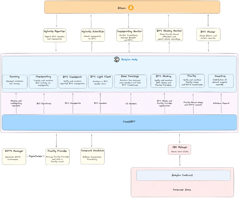 通过“Restaking”技术,Babylon 主要用于提升 POS 链的安全性。然而,如果想实现完整的 Eigenlayer 技术栈(比如类似 EigenDA 这样的功能),或者更加复杂的罚没(Slashing)机制,这还需要 Babylon 生态内的其他项目协同完成。