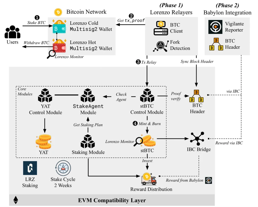 Lorenzo 显然希望在这一赛道中集大成于一体。在 Babylon 开启质押功能后,其 LST 产品具备了与 stETH、Renzo、EtherFI 等 LRT 资产类似的本息分离操作性。Lorenzo 的 LST 产品可以被拆分为两种代币:流动性本金代币 LPT(stBTC)和收益累积代币 YAT。两种代币均可自由转让和交易,持有者可以分别利用它们获取收益或提取质押的 BTC。这种设计不仅提升了资产的灵活性,还为用户提供了更多的投资选择。