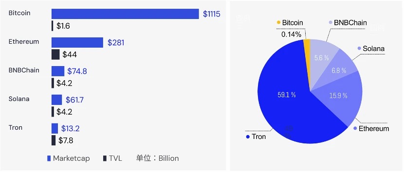 TVL 方面,BTC 作为市值占据绝对优势的加密货币拥有极高的潜力。 目前,BTC 网络 的锁定总价值(TVL)约 16 亿美元(已计入L2和侧链),仅占比特币总市值的 0.14% 。相比之下,其他主流公链的 TVL 与市值之比要高很多,ETH 为 15.7% ,Solana 和 BNBChain 分别为 5.6% 和 6.8% ,按照三者平均值计算,BTCFi 仍有 65 倍的增长空间。