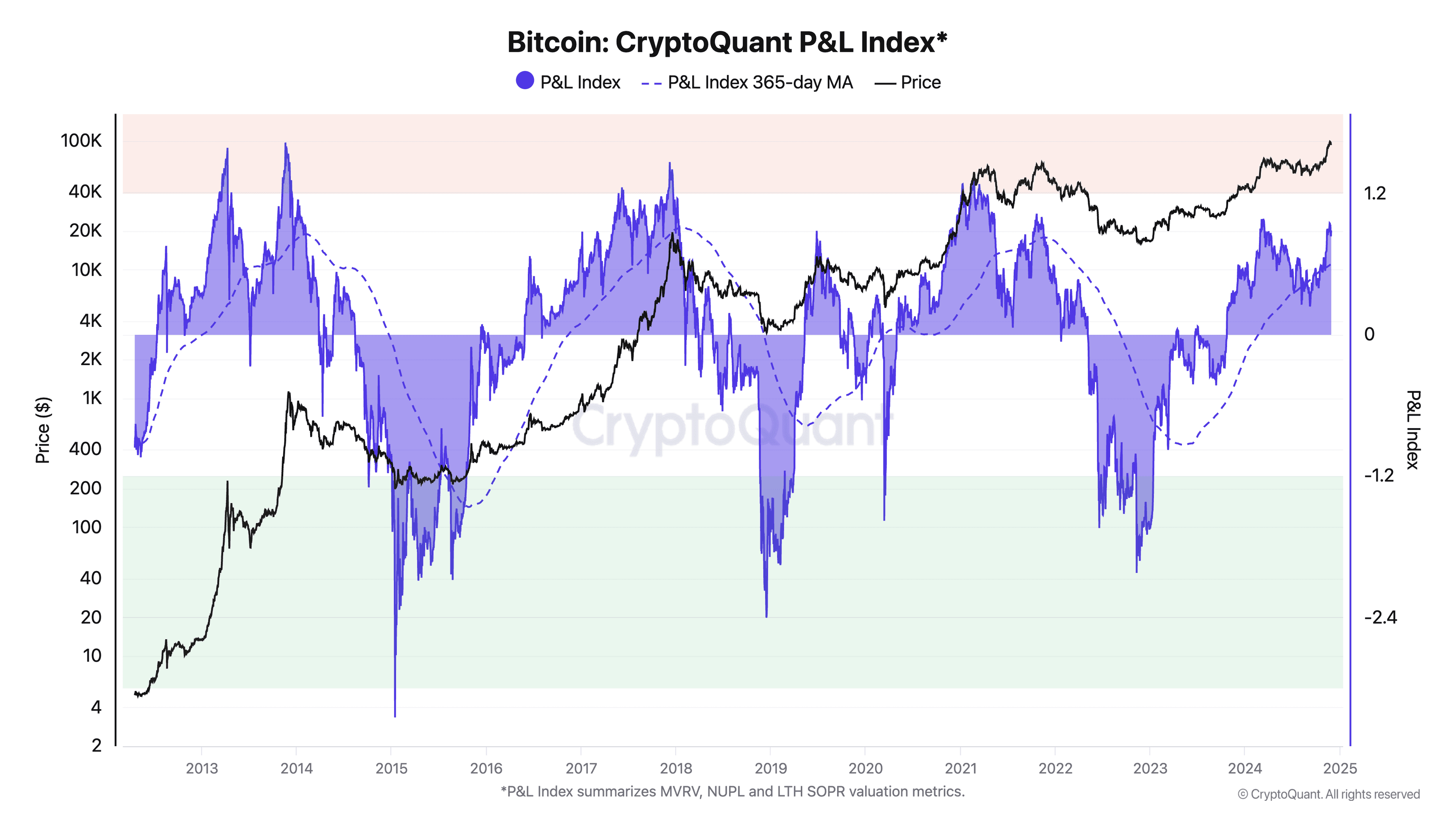 首先,根据 CryptoQuant 的盈亏指数(P&L Index)显示,目前比特币虽然可以确定处在牛市,但还远远没有到达此前牛市的高估水平,市场并没有过热或超𧹒。