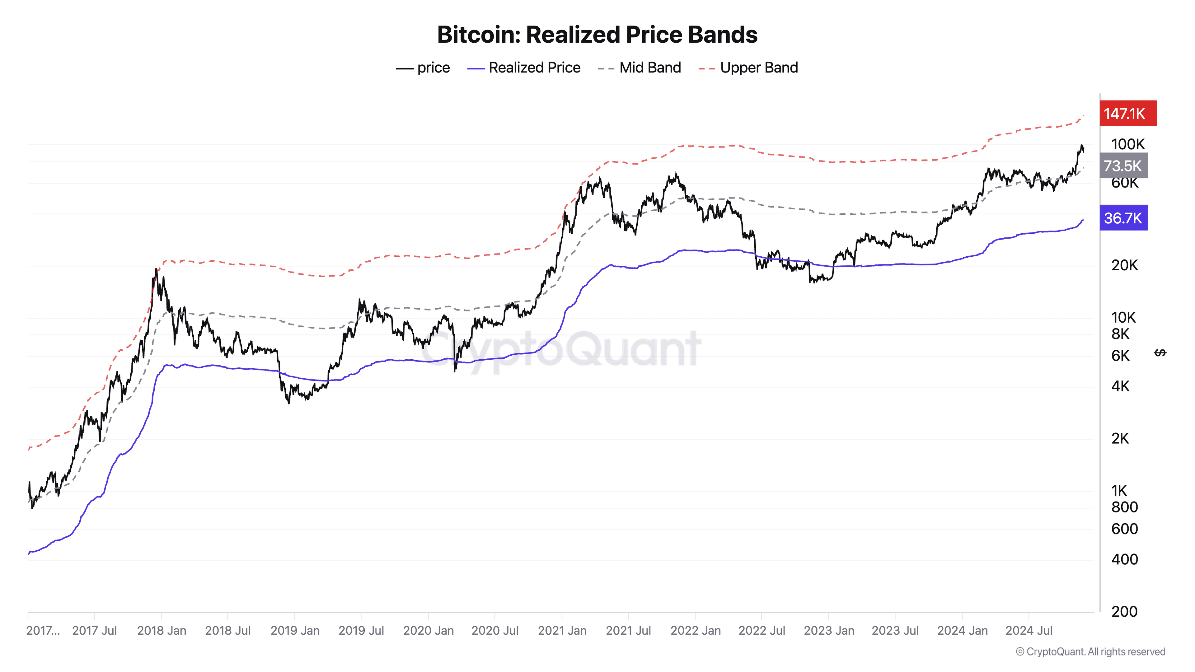目前比特币的已实现价格为 3.6 万至 3.7 万美元附近,这代表著这个高位将落在 14.7 万美元左右。