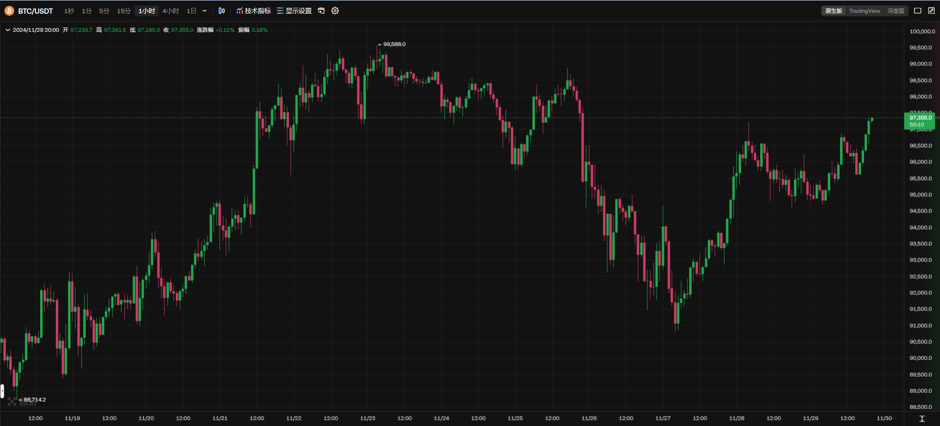 比 特币在 11 月 23 日创下 99,588 美元的历史新高后出现回调,并在 11 月 27 日最低下跌至 90,800 美元。不过撰稿当下比特币出现反弹,报 97,335 美元,近 24 小时涨幅为 2.48%,大有再度冲击 10 万美元目标的势头。
