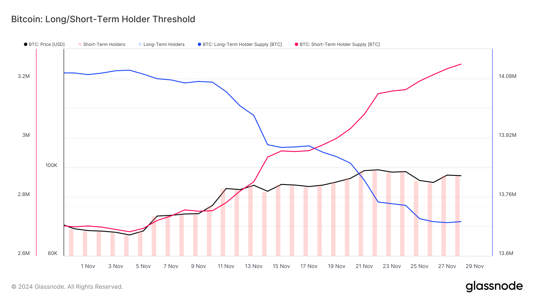 根据链上 数据 ,本周比特币的长短期持有者数据显示,随著价格上涨,短期持有者(红缐)持仓量显著增加,而长期持有者(蓝缐)持仓量则出现减少。