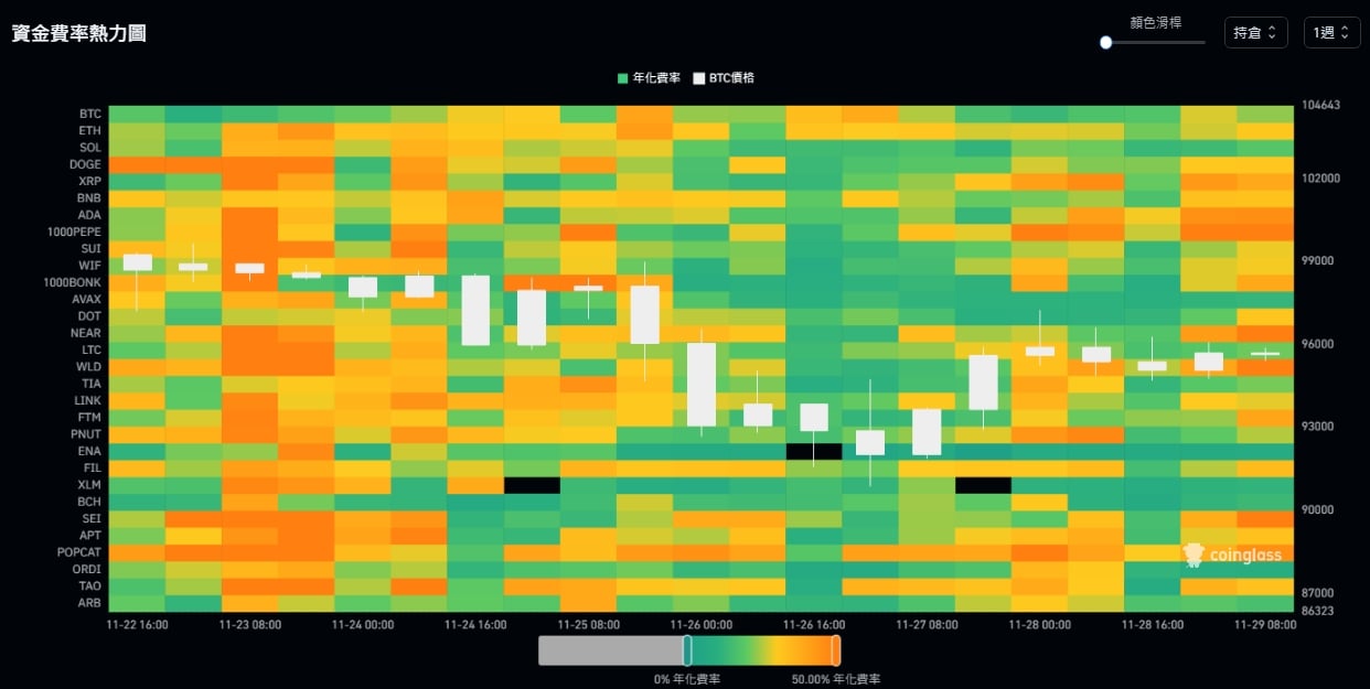 资金费率热力图 展示 了不同加密货币的资金费率变化趋势,颜色从零费率的绿色到 50% 正费率的黄色,黑色则代表负费率;白色 K 缐图则显示比特币价格波动,与资金费率形成对比。