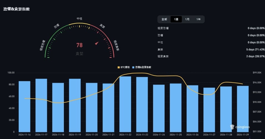 本周的市场情绪 指标 由 80 (极度贪婪)上升至 78 (贪婪),整周在(贪婪)与(极度贪婪)的区间。
