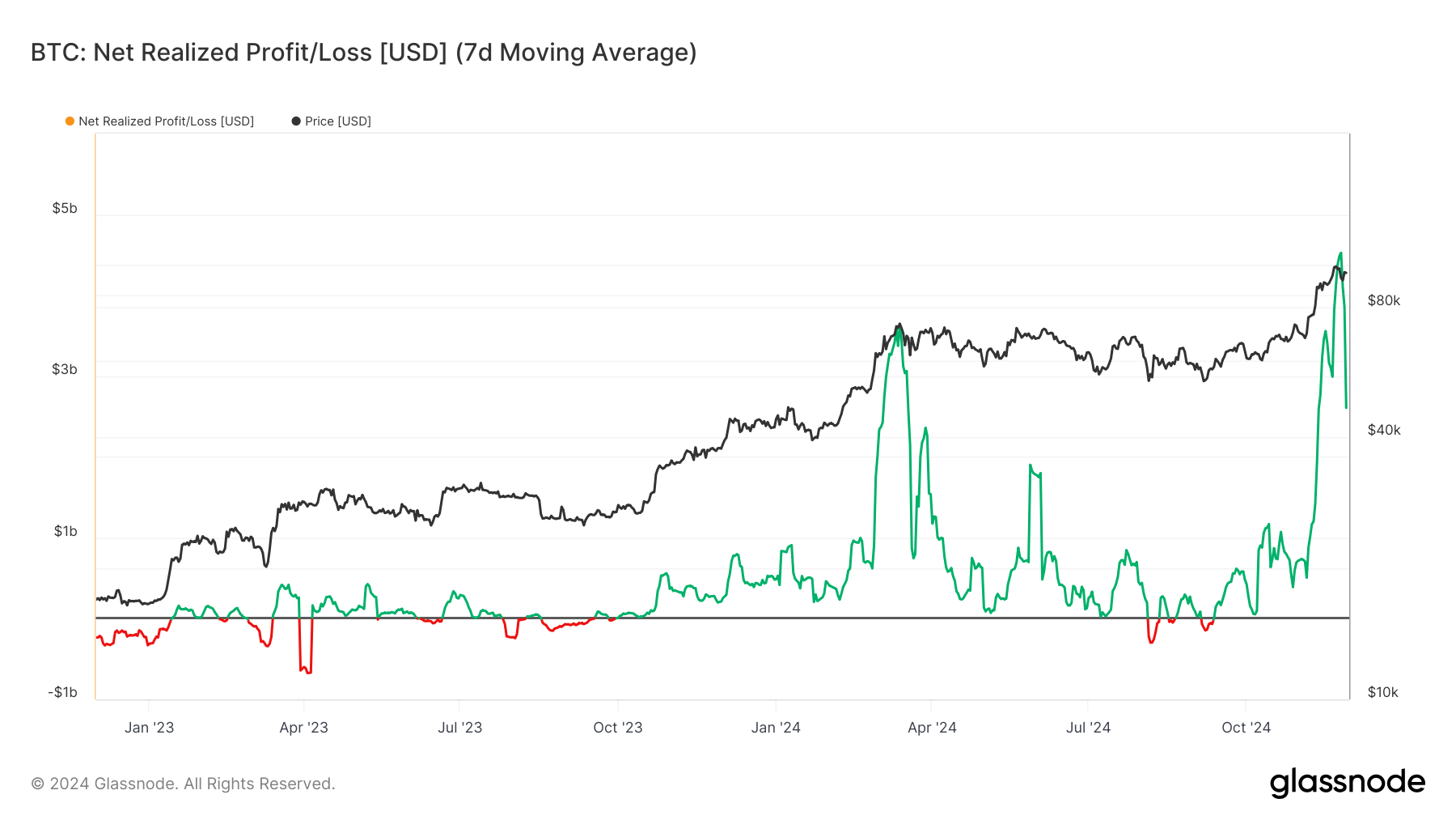 根据链上 数据 ,比特币的长期持有者净持仓量出现显著下降,红色条形图显示出抛售压力逐步增加。自 10 月中旬以来,长期持有者的净仓位变化由正转负,显示出部分长期投资者𫔭始逐步获利了结。这一现象在比特币价格上涨至新高附近时尤其明显,表明市场中的一部分资本选择在高位进行获利,但抛压力道还未到今年 3 月的峰值。