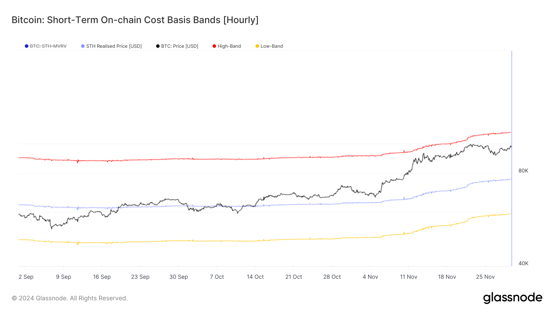 本周比特币短期链上成本基準带 显示 ,价格接近 上轨(红缐)10.84 万美元 ,反映市场情绪高涨,短期投资者盈利意𫖸增强。长期持有者的实现价格(蓝缐)为 7.65 万美元 。