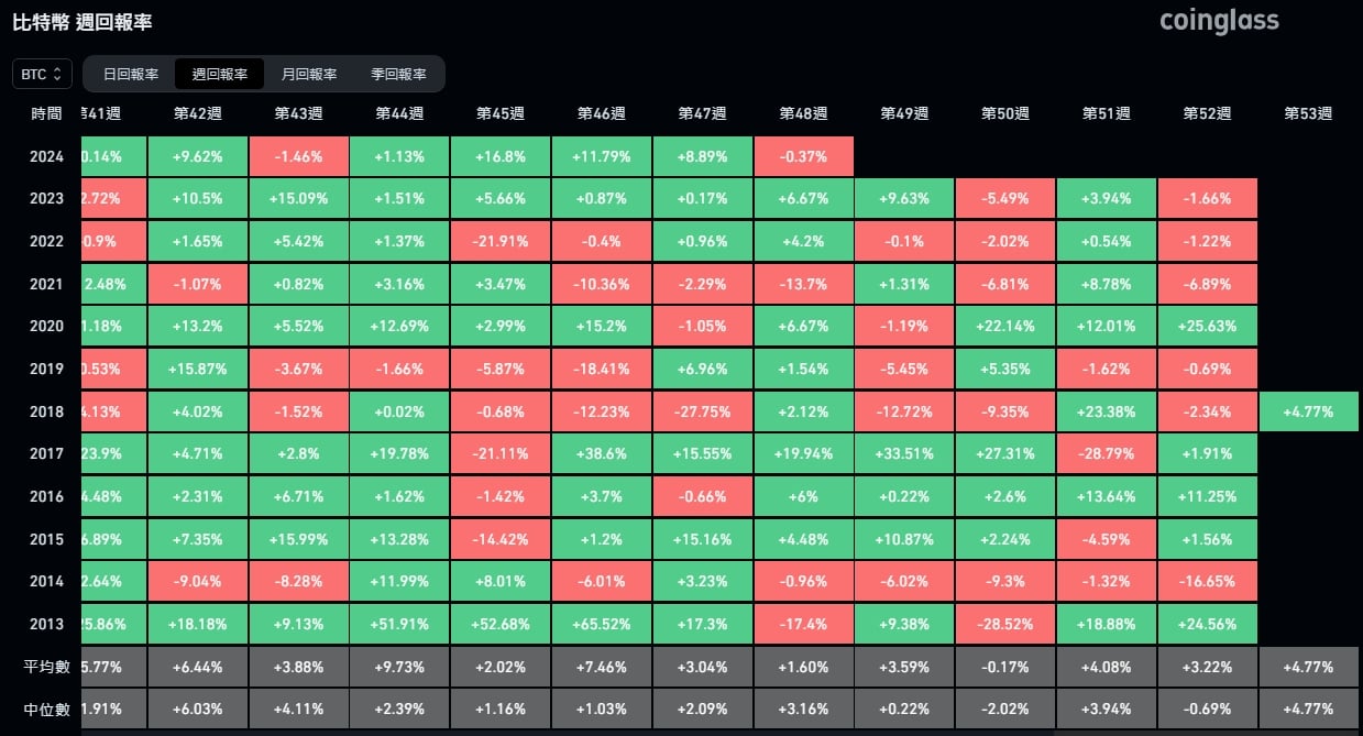 根据历史 数据 第 48 周,比特币的回报率为 -0.37% ,显示该周比特币价格轻微下跌。这一表现不仅低于历史平均回报率 (+1.60%) 和中位数 (+3.16%),还与前一周(第47周)的正回报 (+8.89%) 形成鲜明对比。