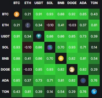 本周数据 显示 BTC 与 ETH 和 SOL 的相关性分别为 0.21 和 0.92,相比上周的 0.80 和 0.82,BTC 与主要代币的相关性有所上升,表明市场资金重新集中于主流币种。