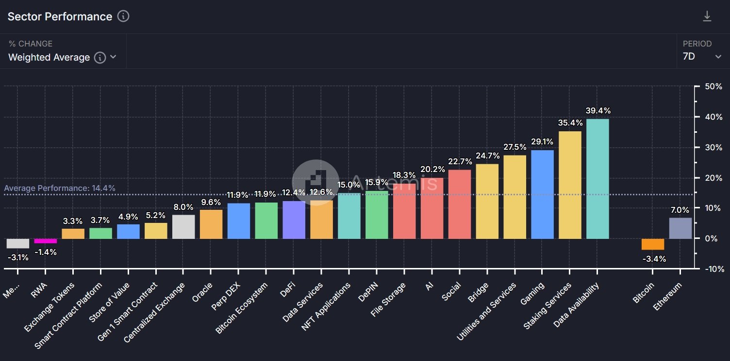 根据 Artemis 数据 显示 ,本周区块链领域板块的平均涨幅为 (14.4 %) ,其中 Data Availability、Staking Services、Gaming 分别以 (39.4%、35.4%、29.1%) 占据前三。