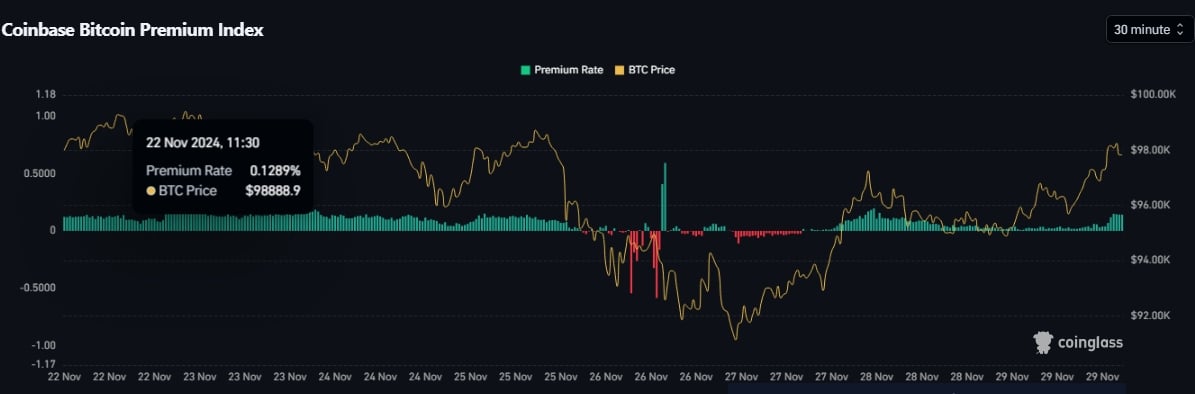 ,表明美国市场对比特币的需求仍在增强。除了周二和周三在亚洲交易时段出现短暂的负溢价外,随后溢价再次上升。