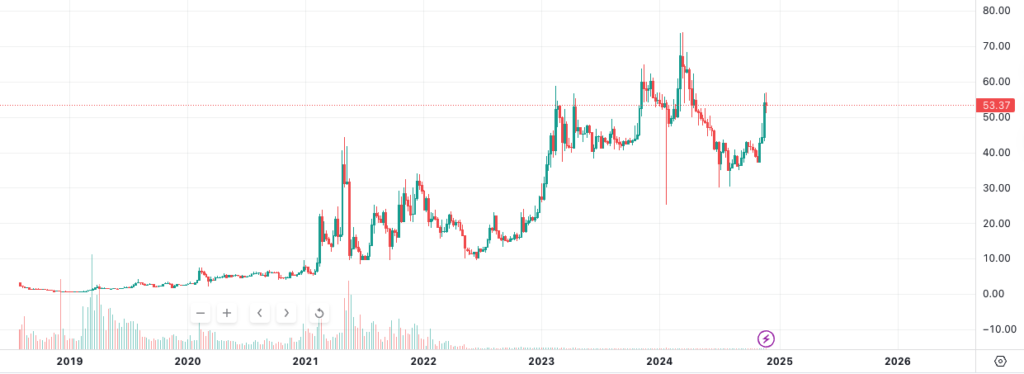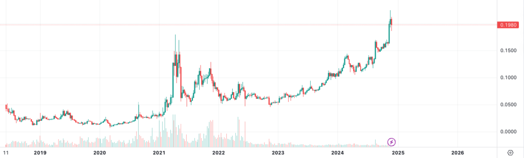 某种程度上,这可能也昭示著随著加密货币投资在美国逐渐成为主流,新入场的资金会集中在优质的标的上,正如美股。而本轮行情中,也有一些曾在上一轮牛市中站上了巅峰的代币在本轮中再次成为了逐利者的宠儿。笔者盘点了部分在 2021 年牛市中创下阶段性高点后本轮再创新高的代币,但瞭解范围有限,可能并未覆盖所有符合此类情况的代币。