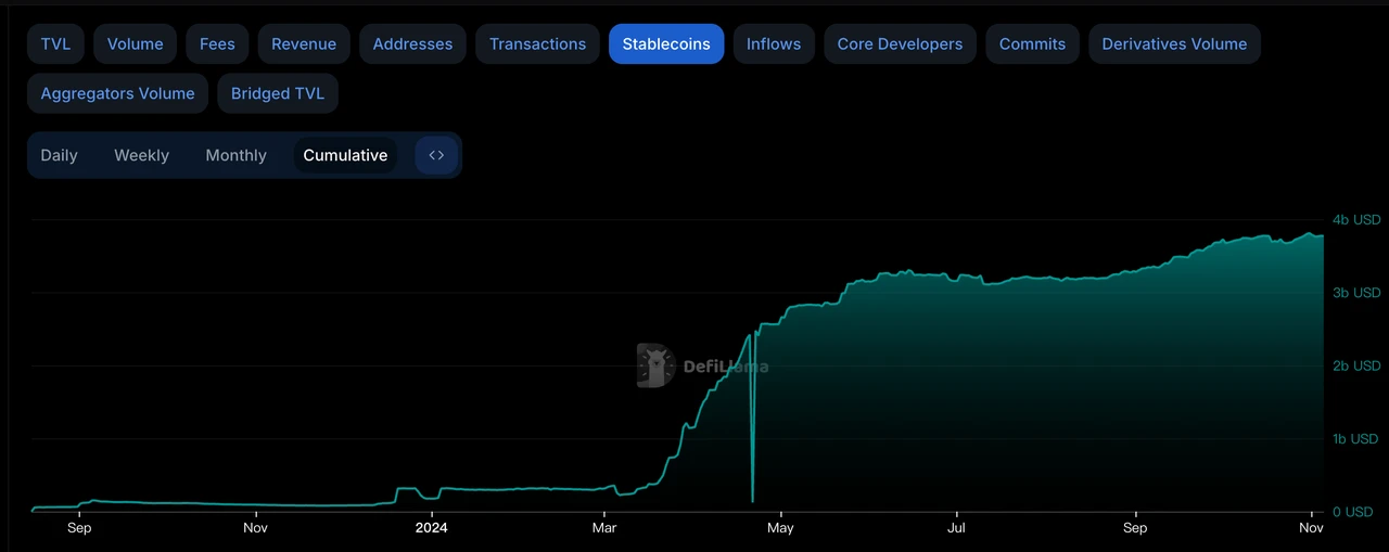 图-7 Base 链上稳定币数量(数据来源:https://defillama.com/chain/Base?stables=true&tvl=false&inflows=false)