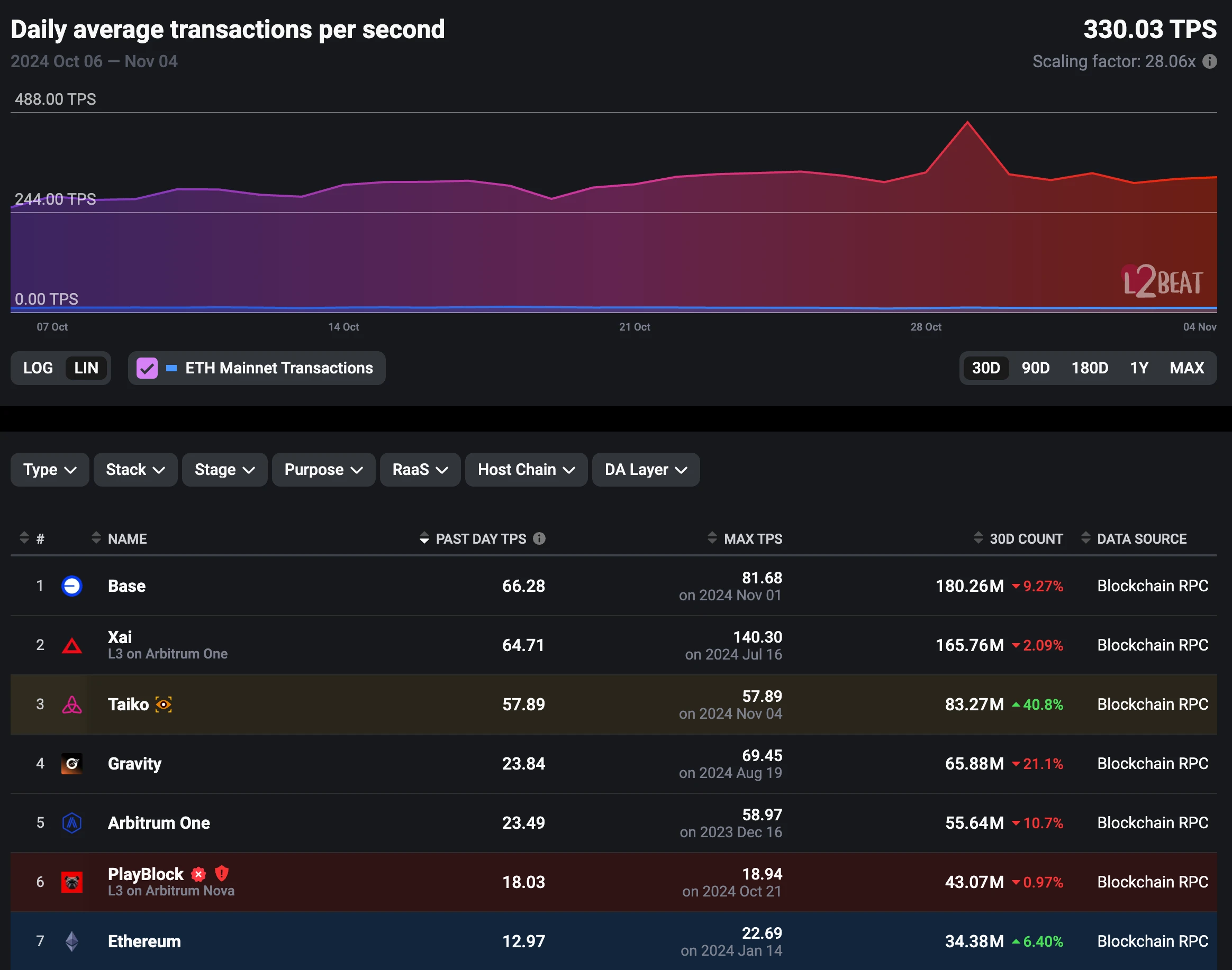 图-5 链上每秒日均交易量(数据来源:https://l2 beat.com/scaling/activity)