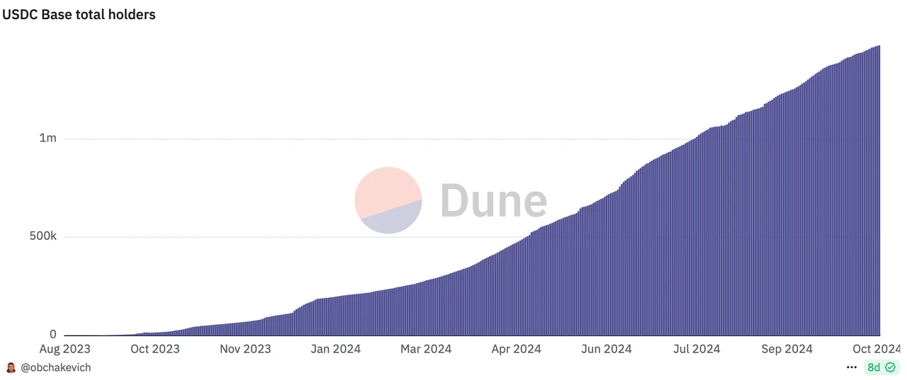 图-9 USDC 在 Base 链上的持有者人数(数据来源:https://dune.com/obchakevich/usdc-base)